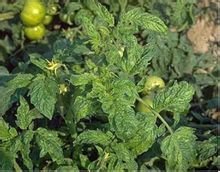 病毒病主要由煙草花葉病毒、黃瓜花葉病毒、馬鈴薯花葉病毒等侵染所致,癥狀隨病毒的不同而變化。癥狀大多是葉片上出現黃綠相間或深淺相間的斑駁,葉脈逐漸透明,葉片微皺,植株較矮,新發葉片較小、結果較小且表皮多有斑紋。也有部分發病葉片自上而下全部或部分變成條狀,中下部葉片向上卷翹,同時花瓣增大形成“巨花”,植株矮化。另外有條斑型癥狀,主要影響果實和莖稈,莖稈有暗綠色或黑褐色油漬狀壞死條斑,果實上多形成不同形狀的褐色斑塊。